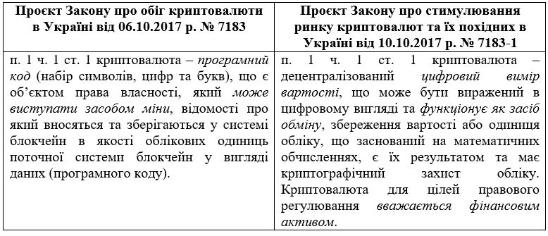 Згодом, 6 жовтня того ж 2017 р. Верховною Радою України було одержано «Проєкт Закону про обіг криптовалюти в Україні» № 7183 (далі – законопроєкт № 7183), згідно із п. 1 ч. 1 ст. 1 якого пропонувалося визначити криптовалюту, як «програмний код (набір символів, цифр та букв), що є об’єктом права власності, який може виступати засобом міни, відомості про який вносяться та зберігаються у системі блокчейн в якості облікових одиниць поточної системи блокчейн у вигляді даних (програмного коду)». А вже 10 жовтня також 2017 р. Верховною Радою України було одержано «Проєкт Закону про стимулювання ринку криптовалют та їх похідних в Україні» № 7183-1 (далі – законопроєкт № 7183-1), відповідно до п. 1 ч. 1 ст. 1 якого пропонувалося визначати криптовалюту, як «децентралізований цифровий вимір вартості, що може бути виражений в цифровому вигляді та функціонує як засіб обміну, збереження вартості або одиниця обліку, що заснований на математичних обчисленнях, є їх результатом та має криптографічний захист обліку. При цьому уточнювалося, що криптовалюта для цілей правового регулювання вважається фінансовим активом».